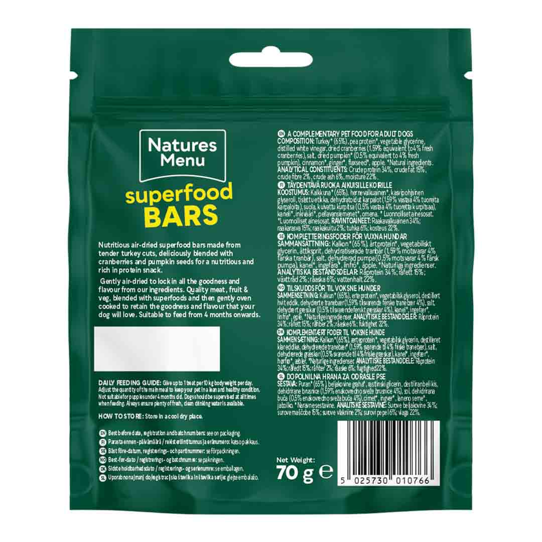 Nutritious air-dried superfood bars made from tender turkey cuts, deliciously blended with cranberries and pumpkin plus other wholesome fruits, vegetables and superfoods for a perfect healthy snack. Individual pack size 70g. Suitable to feed from 4 months onwards.