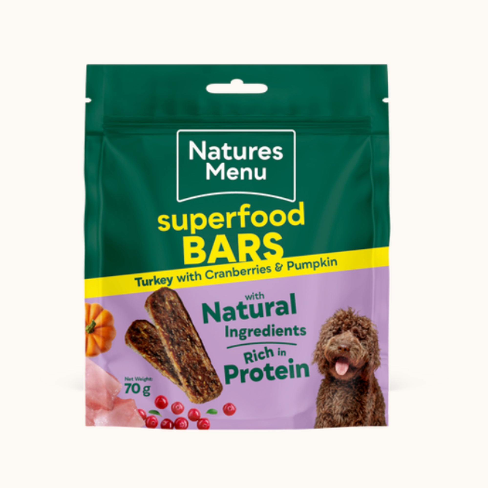 Superfood bars use tender turkey pieces and a natural mix of cranberries and pumpkin to create a nutritious treat full of protein.